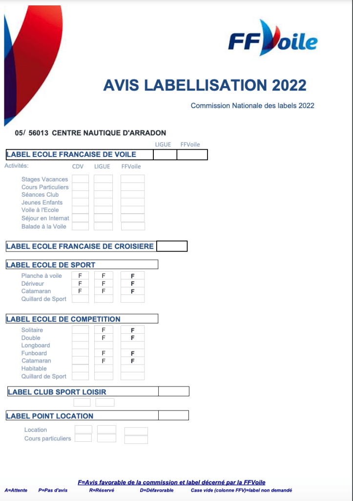 Avis de labellisation 2022 émis par la Commission Nationale des labels de la FFVoile.